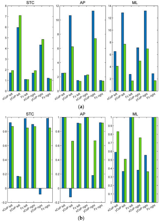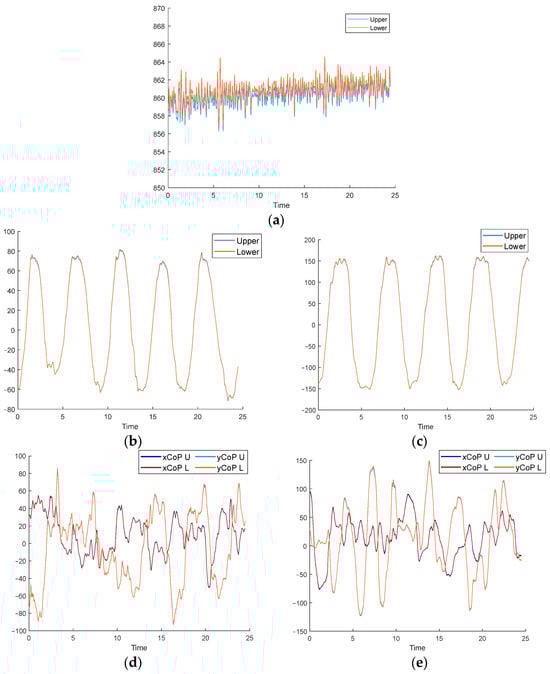 As can be seen in Table 3, the mean values of the RMSE between the upper and lower plates measurements are 0.655 ± 0.22 mm for the xCoP, 0.898 ± 0.49 mm for the yCoP, and 1.72 ± 0.5 N for the vertical reaction force.