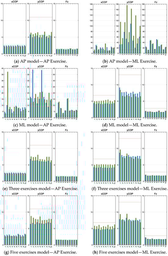 Considering the results obtained, it can be concluded that, although the analytical hypothesis can adequately model the distribution of vertical GRFs between the two feet, it does not have the same level of accuracy in modeling the local CoP displacement, especially for exercises that do not fully meet the hypothesis assumptions (ROT and RND). As a result, the hypothesis is only acceptable for determining the Fz and the xCoP in AP exercises.