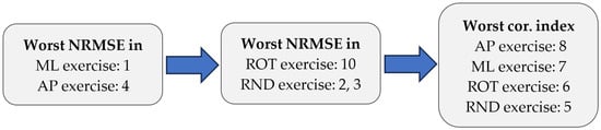 Given the similar outcomes obtained by all models, the selection of the most appropriate one was based on the elimination of those that yielded the worst results, as shown in Figure 10. First, the models that produced the highest NRMSE in the AP and ML exercises were eliminated, since these are the exercises performed by the OREKA machine. According to this criterion, models 1 and 4 were initially excluded. Secondly, the models that produced the highest NRMSE for the remaining exercises were discarded. These are models 2, 3, and 10. To finalize the selection, the models with the worst correlation index, 5, 6, 7, and 8, were eliminated. This analysis indicates that the optimal model is number 9, as indicated in Table 9, corresponding to a two-layer model, one with 10 neurons and one with 25.