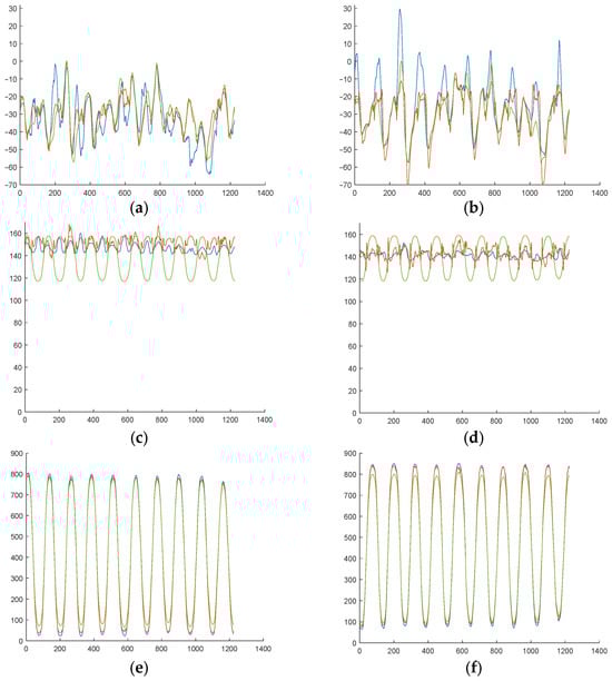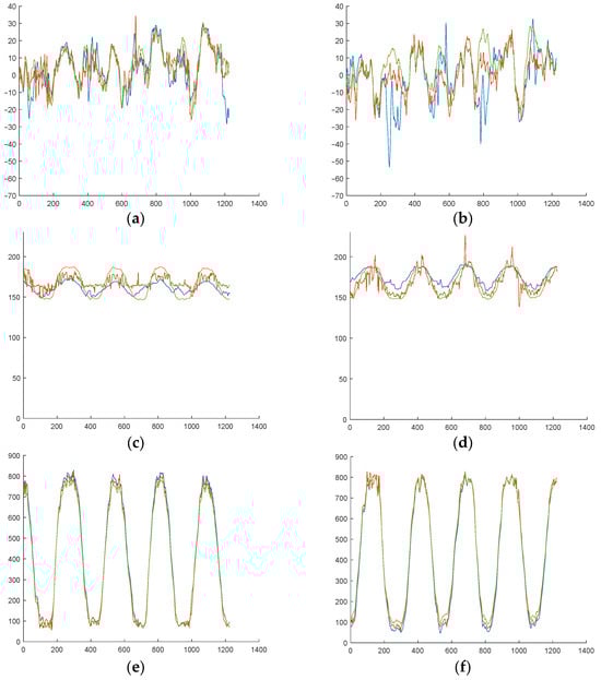 Subject 1 results during an ML exercise. (a) xCoP left. (b) xCoP right. (c) −yCoP left. (d) yCoP right. (e) Fz left. (f) Fz right. Real measure is shown in blue, that predicted analytically is shown in green, and that predicted by the NN is shown in red.