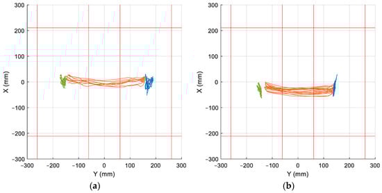 This finding proves that individuals may employ diverse strategies when performing the same exercise. As illustrated in Figure 14b, the subject’s statokinesigram during an ML exercise reveals the global CoP moving laterally while the CoP of each independent foot moves in the AP direction, thereby contradicting the analytical hypothesis. In contrast, Figure 14a presents another subject performing the same exercise, demonstrating better alignment with the analytical hypothesis, as evidenced by the movement of the individual CoP of each foot in both directions.