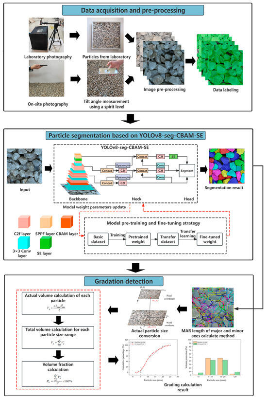 The framework of the IIS-based PGD method is shown in Figure 1, consisting of three steps: (1) data acquisition and pre-processing, (2) particle segmentation based on YOLOv8-seg-CBAM-SE, and (3) gradation detection. In the first step, two different datasets of particle images are established by using a photography setup with a high-resolution camera in the laboratory and a portable camera device (e.g., smartphone) at construction sites, respectively. In the second step, the particles are segmented at the pixel level by YOLOv8-seg-CBAM-SE, and transfer learning is employed to enhance the segmentation performance of the model for on-site images. In the third step, the MAR algorithm with a revolving angle strategy is employed to calculate the gradation of particles.
