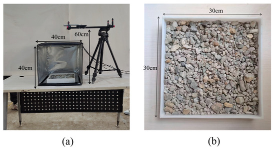 In this study, a controlled photography setup was established in the laboratory to capture particle images. The setup consists of a blackout box, a polypropylene tray, a high-resolution camera, and a retractable mount, as illustrated in Figure 2a. The dimensions of the blackout box are 40 cm × 40 cm × 40 cm, while the tray measures 30 cm × 30 cm × 5 cm. The camera is securely mounted on the retractable stand and positioned directly above the tray at a distance of 60 cm. Then, images are captured for dispersed and densely stacked particles in varied background colors, sizes and shapes, as shown in Figure 2b.