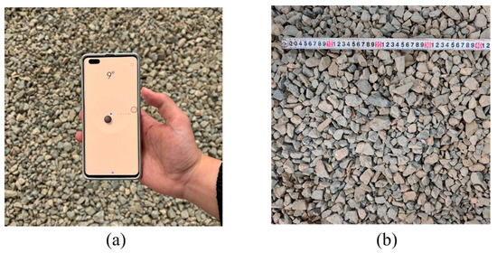 For on-site image collection, photographs are taken using a smartphone positioned parallel to the objects. A leveling application on the smartphone is employed to measure and maintain a consistent tilt angle during image capture, as shown in Figure 3a. The smartphone is then positioned above the objects for photography, with the shooting distance adjustable for different particle sizes. To facilitate the conversion of pixel dimensions into real-world measurements, a calibration scale is placed within the test area, as shown in Figure 3b.