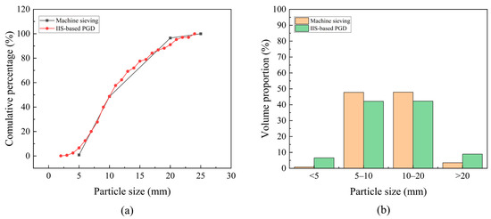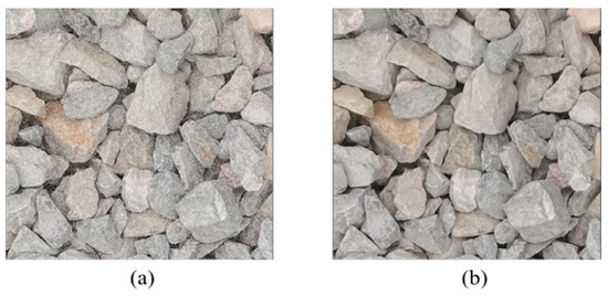 Earth–rockfill dams are one of the most widely used hydraulic structures due to their adaptability and the use of local materials. The particle gradation of rockfill materials plays an important role in determining the compaction quality, permeability resistance, and overall strength and stability of the dam [1,2,3]. To ensure high-quality compacting construction of structures, adopting a reasonable particle gradation distribution is indeed crucial [4,5,6]. The basic task is to conduct the particle gradation detection (PGD) quickly and accurately at construction sites. The on-site screening test is a traditional PGD method, in which random samples are extracted for manual or mechanical sieving, and then particle grading curves are obtained by statistical analysis [7,8]. Although this method is technically mature, it requires considerable time and labor, and it may destroy the integrity of the structure to some extent as well. In addition, it has great limitations in terms of low sampling, which can only represent the particle sizes of a certain point, resulting in unsmooth and incomplete particle grading curves [9]. Therefore, it is of great importance to develop an efficient and accurate PGD method for a massive amount of filling materials in earth–rockfill dam construction.