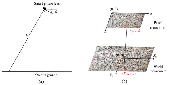 Coordinate transformation: (a) on-site photography; (b) mapping of the pixel coordinate to the world coordinate.