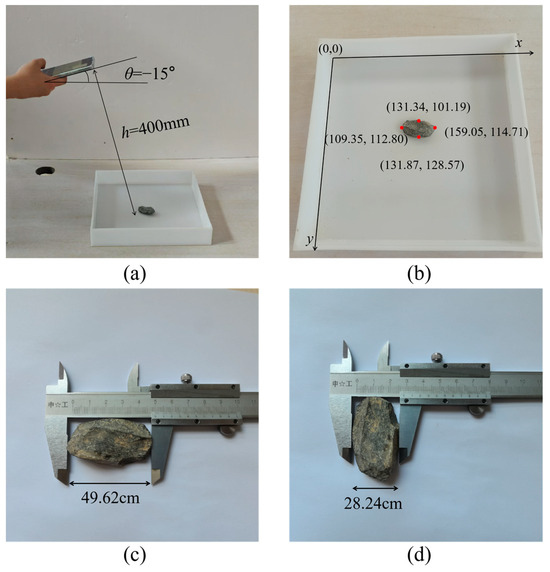 To verify Equation (8), an experimental test was designed and executed in the laboratory. Specifically, a particle was randomly positioned on the tray and captured using a smartphone at a tilt angle of θ = −15° and a height of h = 40 cm, as depicted in Figure 6a. Subsequently, the pixel coordinates of the four key points, which define the major axis length (Lmax) and minor axis length (Lmin) of the particle, were precisely measured and are presented in Figure 6b. The measured values of Lmax and Lmin are 49.73 mm and 27.39 mm, respectively, while the corresponding actual lengths obtained through direct physical measurement are 49.62 mm and 28.24 mm, as shown in Figure 6c,d. The calculated mean absolute error (MAE) of 1.61% indicates that the coordinate transformation in Equation (8) exhibits high accuracy and satisfies the stringent requirements of on-site measurement applications.