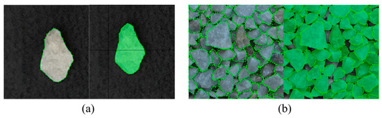 Following the procedure above, particles with varying sizes, background colors, and stack conditions are labeled, as shown in Figure 7. Thus, two sets of data, including particle images collected in the laboratory (named as “Base dataset”) and the ones obtained on-site (named as “On-site dataset”), are prepared and used for model training.