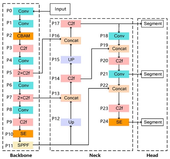 A dual-attention model, named YOLOv8-seg-CBAM-SE, is designed to enhance particle segmentation accuracy in cluttered construction environments, where overlapping or blurred particles pose significant challenges. The proposed model integrates two advanced attention mechanisms, i.e., the convolutional block attention module (CBAM) and SE block, into the framework. The overall architecture of the proposed model is comprised of three distinct components, backbone, neck, and head, as shown in Figure 8.