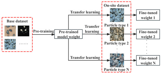 Due to the complex environments at construction sites, the quality of on-site particle images is greatly affected by the lighting condition, shooting distance and tilt angle. Additionally, it is difficult to collect a sufficient amount of data for DL-based IIS in a short time, which is not conducive to the rapid gradation detection of rockfill materials. To solve these issues, a large amount of particle images is collected in the laboratory for pre-training of the IIS model, and on-site particle images are obtained for retraining to fine-tune the parameters of the model.