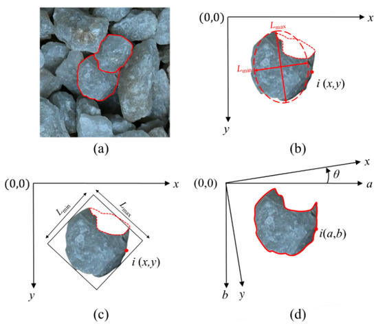 The most widely used method for determining major and minor axes is the Feret diameter method. Based on this method, Lmax is derived from particle contours generated through instance segmentation, while Lmin is estimated via the equivalent ellipse approximation method, ensuring robust measurements for isolated particles. As depicted in Figure 12b, partial occlusion of a particle reduces its equivalent elliptical area compared to the non-occluded state, leading to a significantly lower value of Lmin. Nevertheless, the classification of particles into gradation intervals is highly dependent on Lmin. Unfortunately, the Feret diameter method is prone to systematic errors, which cause particles to be misclassified into finer gradation categories than what their true sizes would warrant. In contrast, the MAR algorithm bypasses the computation of a particle’s projected area by focusing solely on the geometric extrema of its contour, as shown in Figure 12c [66].