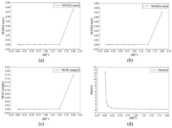 Meanwhile, an angular discretization algorithm is employed to determine the MAR of planar geometric shapes. The algorithm incorporates coordinate system rotation to iteratively evaluate candidate circumscribed rectangles. Within the rotational range [0, π/2], the method performs angular discretization. It computes geometric projections at incremental angles and identifies the optimal MAR by comparing their enclosed areas. Figure 12d illustrates this process. To strike a balance between computational accuracy and efficiency, the angular parameter space denoted by θ is discretized utilizing a constant angular resolution where Δθ is set to 1° [67]. Figure 13a–c illustrate the variation of angular resolution (Δθ) with the mean absolute error (MAE) in terms of the major axis, minor axis, and rotation angle of the MAR, respectively. Figure 13d shows the variation of computational time per image with angular resolution. The results indicate that the MAR error undergoes a sharp increase when Δθ > 1°, while a sharp increase in computational time occurs when Δθ < 1°.