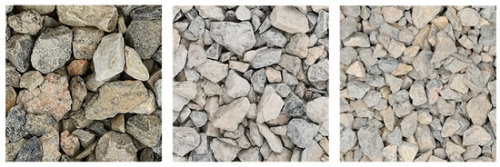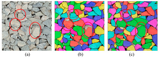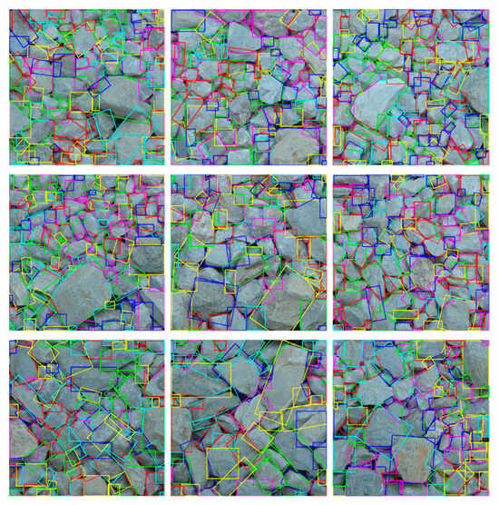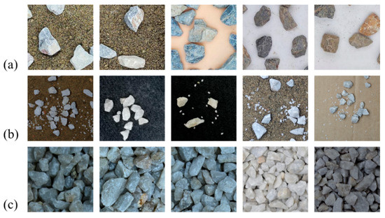 The particle images utilized for the dataset were acquired through both the laboratory and on-site photography methodologies, as detailed in the last section. Special attention was paid to ensure the variations in background colors, illumination conditions, particle sizes, particle colors and distribution states (i.e., sparse and stacked configurations). In particular, the base dataset is categorized into three groups based on the distribution states: (1) Group I: 459 sparse-distributed particle images (Figure 14a); (2) Group II: 760 partially overlapped particle images (Figure 14b); and (3) Group III: 2226 intensively overlapped particle images (Figure 14c). The light intensity was randomly modulated to mimic a wide variety of illumination conditions during the studio photography. Group I utilized basalt gravel particles, typically characterized by a coloration ranging from blue-black to dark gray. Their morphology is angular, with rough surfaces and irregular edges, which can significantly affect the way light is reflected and absorbed during imaging. Groups II and III utilized quartzite gravel particles, exhibiting a color spectrum from white to pale yellow. They possess sharp angularity, with shapes that are subregular and either blocky or flaky. The surfaces of these particles are smooth, and they feature prominent granular blastic textures.