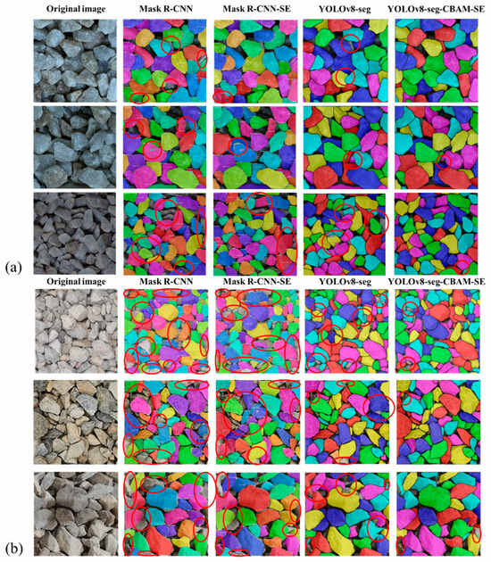 The YOLOv8-seg-CBAM-SE architecture outputs instance segmentation results represented as polygonal contour coordinates, which serve as the geometric basis for particle size distribution analysis, as demonstrated in Figure 12a. For instance-segmented 2D particle imagery, we implement an ellipsoid spheroid approximation method for volumetric estimation, adopting the volume fraction to derive gradation characteristics. The measurement precision fundamentally relies on accurate determination of critical morphological parameters, specifically the major and minor axes of the fitted ellipsoids.