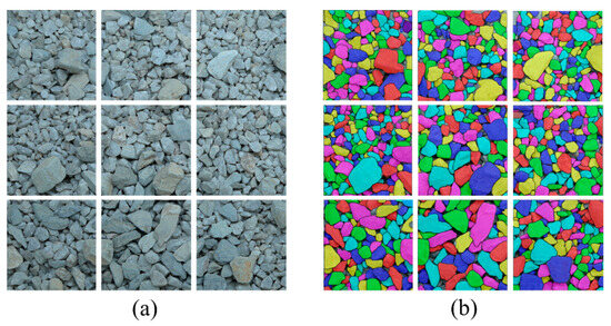 Computer vision (CV) has been extensively applied for image segmentation to extract morphological characteristics of objects, making rapid on-site detection of particle gradation possible [10,11]. Digital image processing (DIP) of image segmentation, such as edge segmentation [12,13], threshold segmentation [14,15,16] and morphology-based segmentation [17,18,19], is widely used for the extraction of particle geometry and contours. Guo et al. [20] investigated the stereo-logical estimation of aggregate gradation for asphalt mixtures based on a morphology-based method. By assuming the aggregate as an ellipsoidal particle in stereo-logical conversion, the gradation can be accurately estimated with a small number of images. Yu et al. [21] designed an image-recognition-based gradation detection system for earth and rock materials. Threshold methods are utilized for image segmentation, and particle contours are detected through the edge detection algorithm of Canny to recognize particle sizes. The system allows the rapid and accurate detection of gradation at a dam construction site. Wang et al. [22] developed a modified watershed-based segmentation method to assess particle size and morphology distributions of aggregate particles. It is verified that this method can accurately extract the contour characteristics of contacting coarse particles, resulting in rapid image processing. Traditional DIP-based gradation detection methods can efficiently recognize aggregate particle contours and extract their characteristics. However, the recognition accuracy is highly dependent on the manually selected segmentation algorithm parameters. Inappropriate parameters in these methods will lead to under- or over-segmentation of the objects.