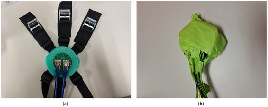 (a) Proposed MCG sensor with 3-layer 3D-printed fixture, ethernet cables, and straps. (b) Previous MCG sensor with jumper wires kept in place with tape [16].