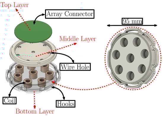 Contrary to [16] where the coils where simply positioned on a plastic base and secured on this base, as well as upon the wearer, with tape (see Figure 1b), a new 3D-printed fixture with a 3-layer structure was introduced. The following explains in details the different layers of the sensor as shown in Figure 2: