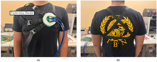 For this study, 10 adults between the ages of 19 and 33 ( = 23.5 years; = 4.11 years) were recruited, as shown in Table 1. For this proof-of-concept study, participants were selected as healthy (i.e., no cardiac conditions) to ensure that changes in mHRV were specifically attributed to CW. Our inclusion criteria (approved by the Institutional Review Board (IRB)) required “healthy” status and normal BMI. No screening for subclinical conditions (like undiagnosed arrhythmias) was performed, but none of the volunteers reported any cardiovascular disease or took cardiac medications. This is important because pre-existing cardiac conditions can significantly affect the HRV. For example, pathological arrhythmias or heart disease often reduce HRV and alter its pattern [29]. By restricting to healthy adults, we ensured our HRV changes reflected cognitive load rather than underlying pathology. For future studies involving participants with known or suspected cardiac conditions, we can leverage the partnership with Nationwide Children’s Hospital to recruit patients who have already been appropriately screened. This approach helps ensure that our findings are not confounded by underlying cardiac issues. Additionally, we can use a three-lead ECG system to aid in detecting arrhythmias, as different types of cardiac irregularities are known to alter the morphology of the heartbeat [30,31]. To determine the sample size of human subjects for validation, we based our decision on previous studies of CW monitoring, which included 10 [32], 16 [33], 12 [34], 9 [35,36], and 11 [29] participants. All participants were males due to the garment being more comfortable in the absence of breast tissue (note the tightening of the ratchet straps in the chest area in Figure 3). The protocol was approved by The Ohio State University Institutional Review Board (protocol # 2019H0259). Though exact measurements of the heart-to-coil distance were not possible to acquire, all subjects had a healthy body mass index (BMI < 30 kg/m2).