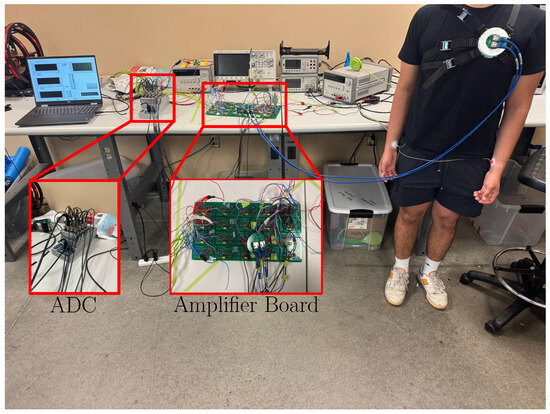 The complete MCG sensor setup is shown in Figure 4. Specifically, the two ethernet cables from the output of the array connector were connected to an amplifier board to improve the noise figure of the system and make it more robust. Similarly to [27], the amplifiers incorporated an input network to suppress oscillations in the input port, were placed a distance away from the sensor coils to reduce noise, and were all mounted on a single board to reduce relative motion/vibrations. Once the MCG signals from each of the coils were amplified, they passed through a 24-bit multi-channel Analog-to-Digital Converter (ADC) from National Instruments (Austin, TX, USA). The ADC operated with a ±10 V power supply and was configured to sample at 5 kHz. The digitized signals were then set as input to a laptop computer for post-processing, as discussed next.