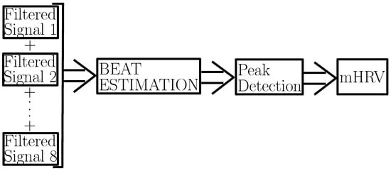 Referring to Figure 5, the first step in signal processing was to filter each of the 8 MCG signals and remove high-frequency noise, such as electrical interference. To do so, a digital band-pass filter in the range [6–36] Hz was applied. The second step was to apply averaging across the 8 band-pass filtered signals. The reasoning behind this averaging was discussed in Section 2.1. To further de-noise the signal and detect the location of each of the heart beats (as needed to retrieve the mHRV), we applied our recently reported algorithm, beat estimation [28]. beat estimation leverages signal averaging and template matching to robustly identify heart beats from noisy MCG signals, achieving a dramatic improvement in the R-peak detection accuracy over the state of the art and nearly perfect mHRV estimation. As a last step, the mHRV was computed. Here, we calculated the mHRV as the mean of the difference in duration between R-peaks, denoted as , which was calculated according to