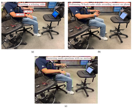 As for the PA engagement, Figure 10a–c show the IMU recordings in both X and Y directions in units of gravitational acceleration g (m/s2) for Scenarios 1 through 3 for one of the subjects. The results confirm that there was minimal to no motion in Scenarios 1 and 3, unlike Scenario 2 where motion was recorded due to the subjects noting the answers of the N-back tasks on the phone. Indeed, Figure 10b shows multiple spikes throughout the presented duration of 20 s, whereas the other Figures do not. Accordingly, the variance was very low in both Figure 10a,c, unlike that of Scenario 2. This behavior was observed across all 10 subjects.