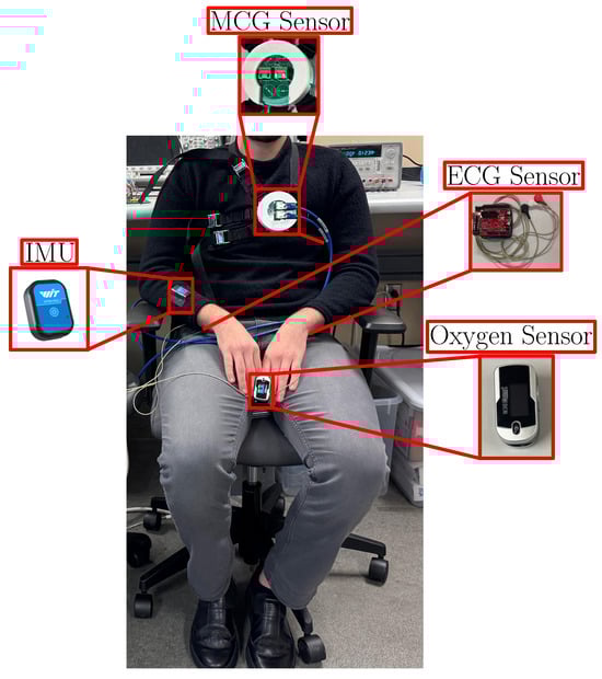 - MCG sensor: The MCG sensor was described in Section 2.1 and Section 2.2. For proper placement on the chest, we counted from the clavicle and down to the space between the third and fourth ribs to identify the location of the heart and aligned the MCG sensor with this location.