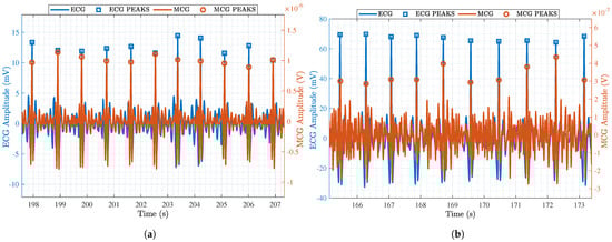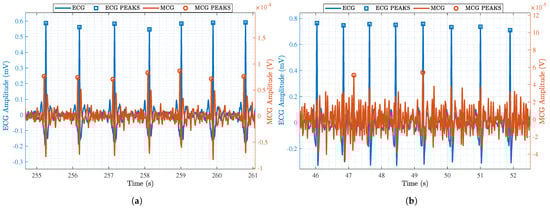 A zoom-in on pre-processed ECG (blue) and MCG (red) data obtained through (a) the advanced MCG sensor reported in this paper and (b) the MCG sensor reported in [16].