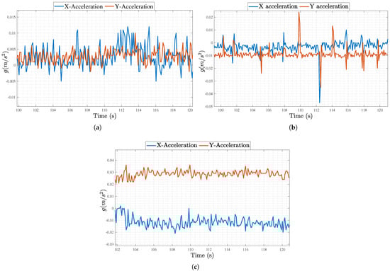 IMU data in X and Y axis in units of g (m/s2) for (a) Scenario 1, (b) Scenario 2, and (c) Scenario 3.