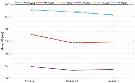 Figure 11 plots the maximum, mean, and minimum values of the obtained through MCG and ECG for each of the testing scenarios. To obtain this plot, we considered the average over the 10 subjects for each scenario. By calculating the percentage error for the mean between the ECG and MCG, we found out that a maximum error of 0.16% occurred in Scenario 1, the lowest error of 0.02% occurred for Scenario 3, while Scenario 2 had an error of 0.15%. As for the maximum, the highest error of 0.55% occurred in Scenario 2, the lowest error of 0.27% occurred in Scenario 3, while Scenario 1 achieved an error of 0.48%. Finally, the error values for the minimum ranged from 0.19% as the highest error in Scenario 3, to almost 0% in Scenario 1, while Scenario 2 had an error of only 0.16%. That is, our mHRV results are almost the same results as those obtained from ECG, which has a very high SNR and is known as the ground truth, with errors not exceeding 0.6% on average when it comes to the minimum, maximum, and mean values of calculated . These results further confirm the adequacy of our hardware and algorithmic setup.