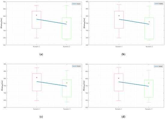 (a) Box plot for MCG for Scenarios 1 vs. 2, (b) box plot for ECG for Scenarios 1 vs.2, (c) box plot for MCG for Scenarios 1 vs. 3, and (d) box plot for ECG for Scenarios 1 vs. 3. The blue line that connects the box plots represents the mean of the calculated HRV in each scenario.