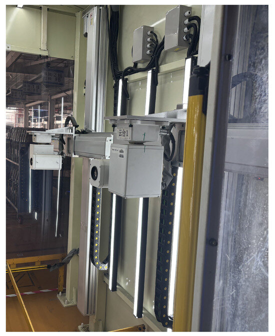 - Mobile Pan–Tilt Imaging Device: To effectively collect images of automotive parts placed on AGV transport racks, four cameras integrated with motion modules are installed on both sides of the photography studio. The cameras can move up and down and rotate left and right through the motion modules to adjust shooting angles, thereby obtaining clear image data. The mobile pan–tilt imaging device is shown in Figure 3, while the physical system hardware is shown in Figure 4.