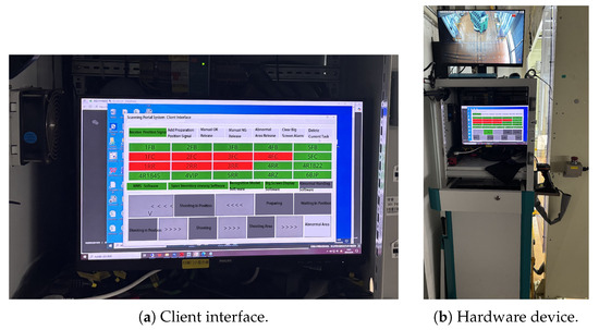 Figure 4. System components overview: (a) client interface showing the operational dashboard and (b) hardware setup of the scanning portal system. All components are designed for industrial-grade reliability. - Client: Integrated with an industrial control computer, monitor, and alarm module, it implements a comprehensive human–machine interaction interface developed based on the OT6.5 framework. The client has the following three core functions: