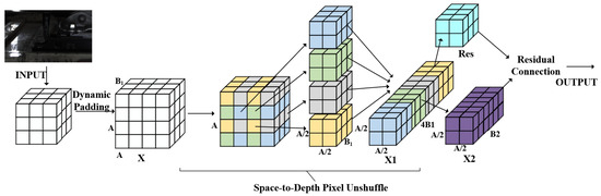 - Dynamic S2D layer (DYS2D): This layer consists of an operation that realizes spatial information recombination and downsampling by combining the checkerboard splitting method with channel rearrangement. During the downsampling process, this layer retains all information to the greatest possible extent. For any feature map X (with a size of ), this layer divides it into sub-maps (each with a size of ) according to the scale (downsampling multiple). If the size of the feature map is not an integer multiple of the downsampling multiple, then a symmetric padding strategy is adopted to fill the feature map, which overcomes the boundary information redundancy caused by the inability of the original SPD layer to process feature maps with non-divisible downsampling multiples. Each sub-map also takes specific position pixel values, with their corresponding probability distributions belonging to different blocks according to the Scale. Softmax is used for normalization. All sub-maps are then concatenated along the channel dimension and corresponding probabilities to form a new feature map , achieving adaptive rearrangement. Compared with X, the spatial dimension of is reduced by a factor of Scale, while the channel dimension is correspondingly increased by a factor of . Through such a transformation, lossless conversion of spatial information to channel information is realized. The correspondence between the elements in the new feature map and those in the original feature map X is shown in Equation (1), where i and j are the spatial coordinates of the output feature map, k is the channel index of the output feature map, and C is the number of channels. The specific form of the softmax probability distribution is shown in Equation (2), where represents the softmax probability at position for channel k and the summation in the denominator is computed over all spatial positions in the input feature map for the same channel k: