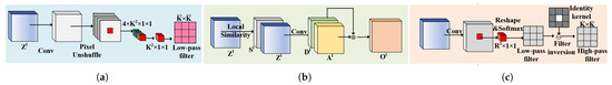 The three basic components constituting the AdpFreqFusion module: (a) adaptive low-pass filter, (b) offset generator, and (c) adaptive high-pass filter.