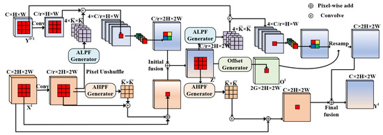 Adpfreqfusion feature fusion is mainly achieved through two stages, namely, adaptive initial fusion and final fusion. In the general initial fusion process, high-frequency and low-frequency information is fused and compressed as shown in Equation (10) to obtain in order to provide efficient features to the three generators. However, high-resolution information merged in this way will have problems such as blurred boundaries and class inconsistency, meaning that it is still necessary to combine the adaptive low-pass filter, offset generator, and high-pass filter for enhanced fusion. The fusion operation is shown in Equations (11)–(18).