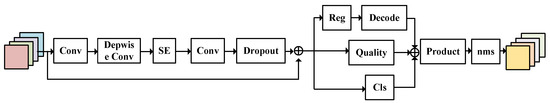 Figure 10 shows how the GFL-MBConv module achieves efficient feature extraction and object detection through multistage processing. Its processing flow is as follows. First, a 1 × 1 point-wise convolution is adopted to expand the channels of the input features, increasing the feature dimensions to provide a richer information base. Subsequently, a depth-separable convolution structure is introduced, which consists of depth-wise convolution (DWConv) and point-wise convolution (PWConv). It first performs spatial feature extraction independently for each channel, then integrates cross-channel information through point-wise convolution. This design maintains a strong spatial feature extraction ability while significantly reducing computational complexity [21]. To further enhance the feature representation ability, a Squeeze-and-Excitation network (SE module) is embedded in the module. This module first preserves the original feature information through a residual connection to avoid the gradient degradation problem. In the squeezing stage, global average pooling is used to compress the spatial dimensions to 1 × 1 × C. In the excitation stage, a “bottleneck” structure (first reducing the dimension to 1 × 1 × C/r and then restoring to the original dimension) containing fully-connected, ReLU, and sigmoid layers is used to generate channel attention weights. Finally, adaptive feature enhancement in the channel dimension is achieved through feature recalibration [22]. The feature processing flow also includes using point-wise convolution to reduce the dimension in order to match the number of input channels, resulting in a reduced the number of parameters, as well as adding a dropout layer prior to the fully-connected layer in order to prevent overfitting by randomly deactivating neurons. The detection head part adopts a multi-branch design: