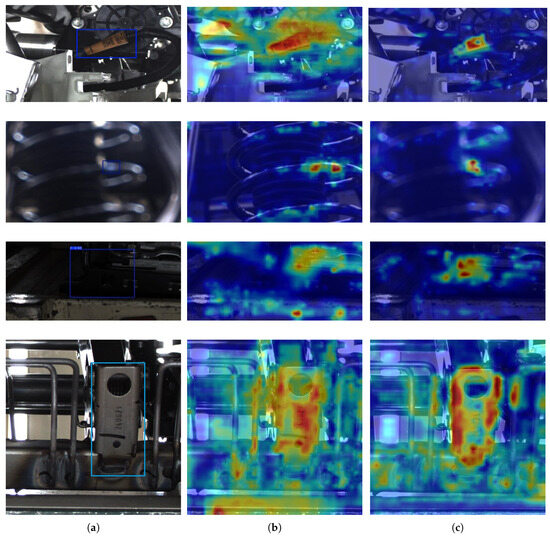 Figure 12. Comparative visualization of corresponding heatmaps. (a) The origin images. (b) Pre-A2C2f-SA integration. (c) Post-A2C2f-SA integration. - Detection Results Visualization: To visually demonstrate the detection performance of the enhanced YOLO, we compared its results with YOLOv8n and YOLOv12n on automotive component dataset images.As shown in Figure 13, when processing low-quality images with a confidence threshold of 0.5, YOLOv8n and YOLOv12n fail to detect the target objects, while our enhanced YOLO model successfully identifies them, demonstrating superior robustness. Although our enhanced YOLO shows slightly lower precision in harness port detection due to its reduced parameter count and computational complexity, it achieves higher confidence scores than YOLOv8n in tie rod detection and avoids the multiple bounding box issue observed in YOLOv12n.