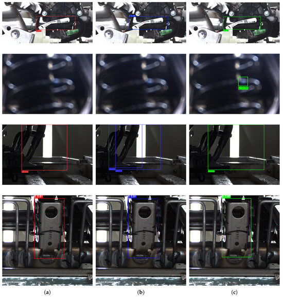 The dataset includes four inspection targets, namely, label characters, color, and shape features, comprising a total of 10,915 images. Additionally, the dataset includes specific quantities for other components: the number of front suspension springs is 2145; the number of wiring harness ports is 2782; the number of tie rods is 3512; and the number of RZ components is 2476. Annotation was performed using X-AnyLabeling. To improve model generalization, random HSV perturbations were applied to the images: hue was adjusted by ±1.5%, saturation by ±70%, and value by ±40%. For geometric augmentation, random translations of up to ±10% in both horizontal and vertical directions, scaling by ±50%, and horizontal flipping with a 50% probability were implemented. These augmentations expanded the dataset to 32,745 images. The dataset was partitioned into training, validation, and test sets using a standard 80–10–10 split. A sample subset of the dataset is shown in Figure 11.