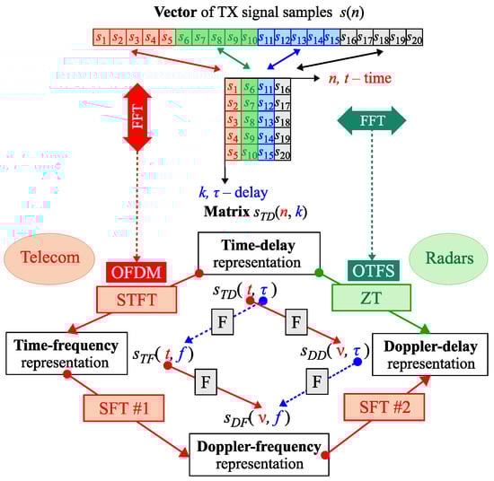 Graphical explanation of the relationship between OTFS and OFDM. Denotations: IR/FR-impulse/frequency response, F—Fourier transform, SFT—2D symplectic Fourier transform, STFT—short time Fourier transform, ZT—Zak transform.
