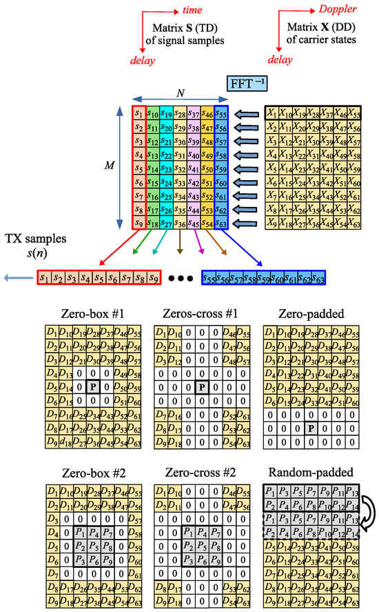The pilots do not necessarily occupy all subcarriers in the pilot zone, and some of the subcarriers can be inactive (the so-called guard carriers, which have a form of a strip, box, or cross). The guard interval is denoted by 0s in Figure 2. Also, depending on the configuration, the shape of the pilot zone and positions of the active (non-guard) carriers could be different. Guard carriers are used to reduce the interference between pilots and data carriers, but the drawback of many zero-value guard carriers is the reduction in pilot power. RP-OTFS [22,23,24,25,26] does not use guard carriers and offers better channel estimation characteristics. In this paper, RP-OTFS is discussed in its original form version [22,23,24,25,26] and in an improved form in the context of the ISAC system. The RP-OTFS represents a completely different approach in the OTFS design, since in its original proposition, the zero guard zone is missing and the pilots have randomly chosen values.