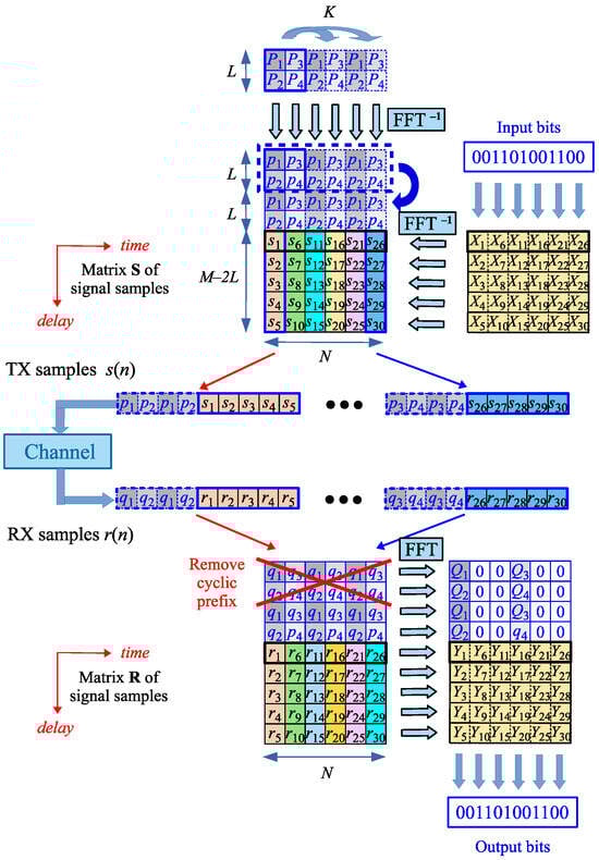 In the RP-OTFS transmitter, the data part of the TD matrix is obtained by the inverse Zak transform of the DD data matrix that carries transmitted bits (computed as IDFTs of the rows of the matrix —see Figure 2). However, in contrast to all known types of OTFS, the pilot samples are inserted directly into the matrix with data in the TD domain as some of its additional first rows: an additional prefix. Then, samples of the “hybrid” TD-domain matrix containing alternately blocks of pilot and data samples are transmitted column by column through a communication channel.