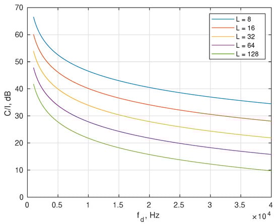 In Figure 4 the dependence of the C/I ratio on is shown for different lengths L of the pilot symbol. The carrier frequency in this example is 70 GHz. This frequency was chosen to be very close to the maximum carrier frequency (71 GHz) from the 5G specification [11]. It results from Figure 4 that RP-OTFS usage is possible in scenarios with a short impulse response. In Table 1 maximum velocities of moving objects are shown, for which the C/I ratio of the pilots is kept at least at the level of −40 dB and −50 dB.