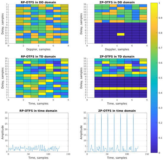 It was mentioned in the introduction and also will be shown in the system model (Section 4) that in case of fractional reflections, the OTFS can lose its orthogonality and the carriers begin to interfere. This effect is also observed between the data carriers and between the pilot and the data carriers. In most modern communication standards, the pilot power is usually higher than the power of the data symbols [39,40]. This means that even stronger interference can be expected between pilots and data carriers. However, unlike the ZP-OTFS, where the whole power of the pilot zone is concentrated in only one active pilot carrier, the RP-OTFS is devoid of this drawback because it distributes the total energy among a large number of active pilot carriers. With the same total power in the pilot zone as in ZP-OTFS, the power of each active pilot carrier of the RP-OTFS will be times lower. This makes RP-OTFS attractive from the ICI reduction and Peak-to-Average Power Ratio points of view. In Figure 5 an exemplary RP-OTFS and ZP-OTFS in the DD, TD, and time domains are depicted. The power of the pilots for both waveforms is the same.