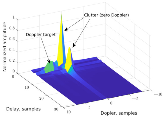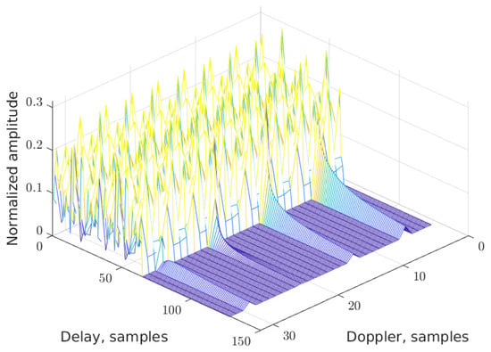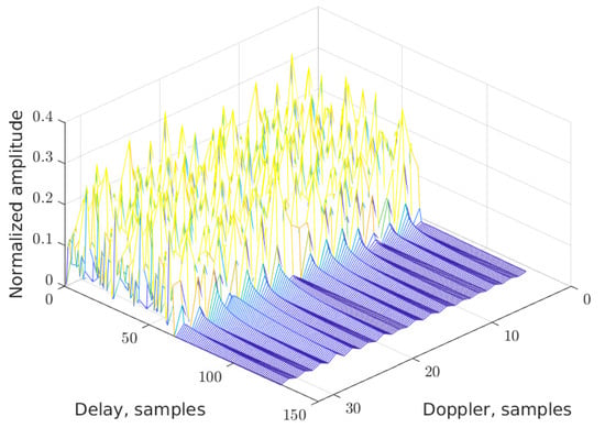 In this article, we focus only on the CSI-based approach, explained in [23,26], as it has a more common processing part with the communication subsystem than CAF. In the CSI-based approach, the results of the OFDM-like pilot-based CIR estimation are used to detect the targets. This reduces the complexity of radar processing significantly lower than in the case of CAF-based processing. Another not-so-straightforward disadvantage of the CAF is that the limited freedom of choice of waveform parameters can be critical for the shape of the ambiguity function. This limitation comes from the fact that the waveform structure we choose should allow the decoding of the transmitted data in a receiver. For this reason, some additional communication components should be inserted into the transmitted signal that are treated as unwanted “artifacts” by the radar subsystem, e.g., repeating reference pilot signals and repeating fragments of OFDM waveforms called a cyclic prefix. The repeatable parts of the signal generate undesirable peaks in CAF, so-called ghosts [25].