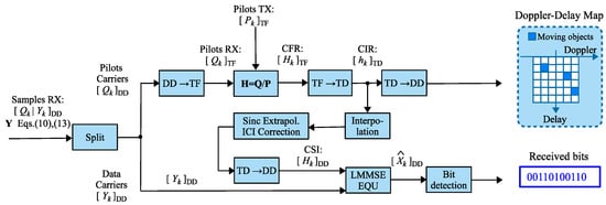 where is the discrete Fourier transform matrix of size N, is the identity matrix of size M, ⊗ is the Kronecker product, † denotes complex conjugation and transposition, and finally, and are noise and data variances (see Figure 6). The fast algorithm for solving (11) is proposed in [44]. The whole channel estimation and equalization process can be performed in the DD domain. In this work, the Matlab code of the LMMSE equalizer [15], designed for ZP-OTFS, is used.
