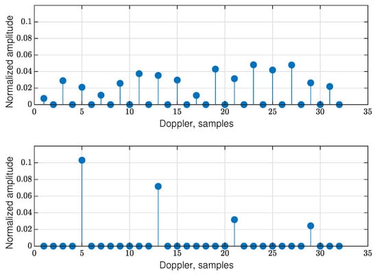 Let the received signal be denoted on the DD grid as . The vertical vectors and are the m-th rows of and , respectively: . By combining vectors we define the vertical vector , similarly to . For simplicity, we will normalize the delay and Doppler to the DD grid resolution in the following way: is a normalized delay, and is a normalized Doppler. Here, it is important to note that and are not necessarily integers; they could be fractional values, as mentioned in the Introduction. We will denote the set of all time delays by , and the set of all Doppler frequency shifts by . The complex gain/attenuation, corresponding to the delay and the Doppler offset , is denoted as . At this stage, we assume that the maximum delay of reflections is not very large (a few samples). We also assume that the Nyquist sampling theorem is also met in the Doppler direction, that is, .