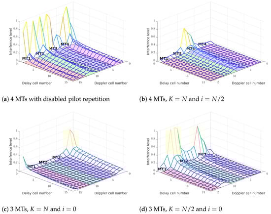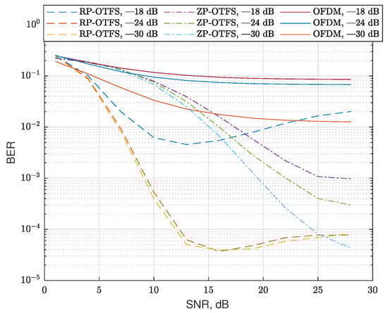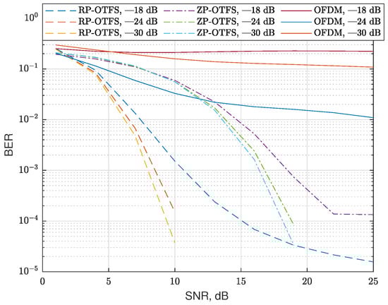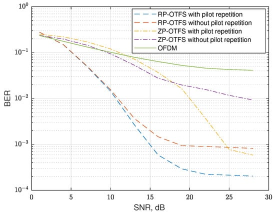In the next scenario, sinc extrapolation-based data-to-data interference compensation is always enabled and we compare only the system performance with and without pilot-to-data interference compensation (by the introduced pilot repetition in the Doppler direction of the DD grid), proposed in Section 5 and graphically explained in Figure 12. At present, we simulate a strong clutter reflection. We use Doppler reflection parameters the same as in the previous scenario, but pick only one magnitude dB. However, we also add a strong reflection on zero Doppler, the magnitude of the reflection being dB. The magnitudes of Doppler reflections are normalized to the main line of sight (LOS) propagation path. The maximum delay of the clutter reflections does not exceed . Here, it is important to notice that for moving the transmitter or receiver, the reflections from static objects will also have Doppler. For this case, the parameters of the pilot repetitions K and i should be chosen to exclude the influence of these strong reflections in the DD domain. In the cases where the pilot repetition was enabled, the column of the DD grid where the interferences were concentrated was excluded from processing, for both types of signal, ZP-OTFS and RP-OTFS. This simulates the case of interference between MTs described in Section 5.