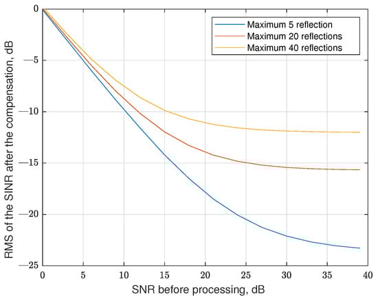 We estimated the dependence of root-mean-square (RMS) of the signal to interference and noise ratio (SINR) on the SNR of the signal before applying the channel, for different numbers of reflections. The reflection coefficient had a normal distribution with the same variance as active data cells, delays had a uniform distribution in the range of , and the Doppler was also distributed uniformly in the range of . The other parameters of the grid had the following values: . The results of the simulation are shown in Figure 13.