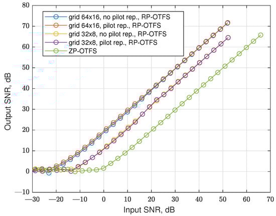 For radar simulation, we added Doppler to a strong reflection and used a CSI-based approach only, as discussed in [5]. The results obtained are presented in Figure 17. As the data transmission does not influence the radar subsystem and in the CSI-based approach only pilots are used for target detection, we define input SNR as the ratio of the average power of active pilot carriers to noise on the input of the receiver. The output SNR is the average power of the detected peak compared with the average power in the DD grid cells without any targets. As expected, the ZP-OTFS has no processing gain, and the processing gain of the RP-OTFS depends on the number of active pilot carriers.