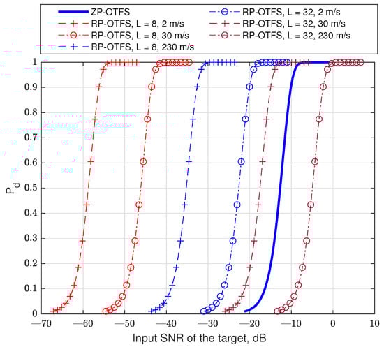 Figure 18 presents the simulated probability of the right detection depending on the SNR, for a constant false alarm ration and for different pilot lengths L and different velocities of the target. In our simulation, we took into account the interferences between carriers in the OFDM-based pilot. The ZP-OTFS was used as the baseline for our simulations. The performance in the case of ZP-OTFS does not depend on the velocity of the target (until it remains in one resolution cell during the whole OTFS frame). In this simulation, we do not take into account the cell migration of the target.